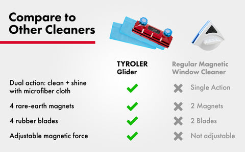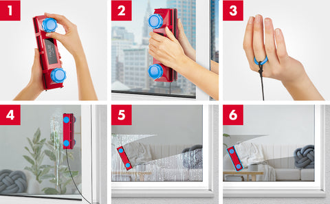 Q: What safety precautions should I consider when cleaning windows with the Glider? A: First. don’t lean out the window. When using the Glider. you only need to open a window enough to place the exterior half of the Glider on the other side of the glass. Make sure you place the safety string on your finger or close it in the window to secure it. Second. these tools use strong magnets. Don’t ever try to place a finger or body part between the two halves to separate them or to check how strong they are.